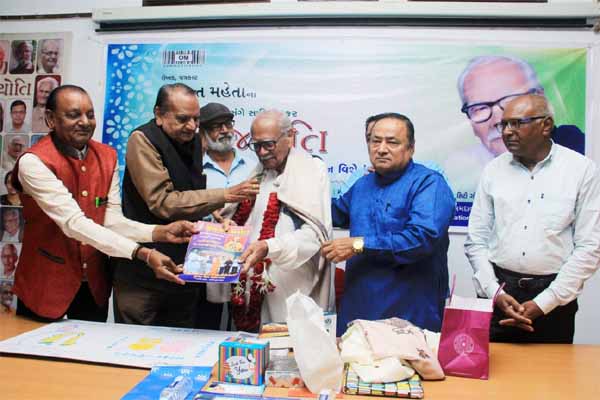 Yashwant Mehta was honored with a garland, shawl, and a book of Shrimad Bhagwat Gita by Gujarat Journalists Union .
