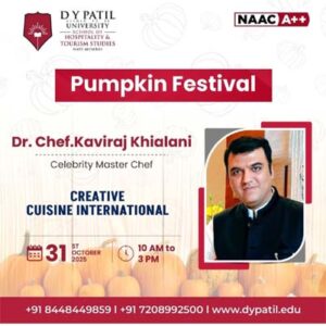 The D.Y. Patil University School of Hospitality Management & Tourism Studies came alive with color, flavor, and creativity during the Pumpkin Festival – Halloween Theme, held on October 31, 2025. The event, conceptualised and executed entirely by students, showcased their culinary artistry, design innovation, and teamwork, transforming the campus into a festive carnival of imagination.