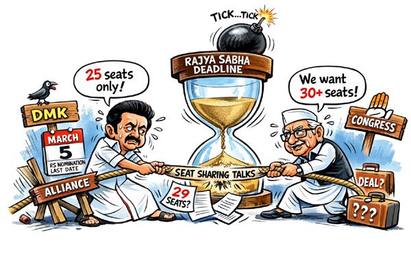 With the deadline for filing Rajya Sabha nominations set to end on Thursday (March 5, 2026) political attention in Tamil Nadu has sharply focused on the ongoing seat-sharing negotiations between the Dravida Munnetra Kazhagam (DMK) and the Indian National Congress ahead of the 2026 Assembly elections — a process that has both parties scrambling to secure common ground on assembly slots and Upper House berths.