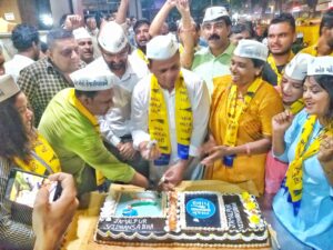 Vice president of AAP Gujarat Minority Wing Amjad Khan Pathan on Tuesday celebrated party chief Arvind Kejriwal’s birthday by cutting a 15-kg cake. The celebration was held in Lal Darwaja area of Ahmedabad.