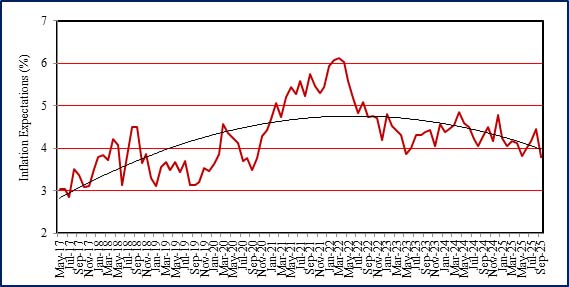 The one-year-ahead business inflation expectation, derived from the mean of the individual probability distribution of unit cost increases, fell by 66 basis points to 3.79% in September from 4.45% in August 2025. Over the past twelve months, firms’ inflation expectations have remained largely anchored around 4.19%, the report noted.