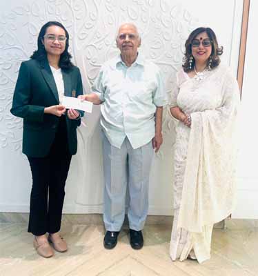 DPS Society Chairmen B.K. Chaturvedi presents a cheque of ₹1,00,000 as a token of appreciation to Delhi Public School-Bopal, Ahmedabad Scholar Ishani Debnath - CBSE India Topper & CBSE Worldwide Topper, while Principal Sabina looks on-NE photo