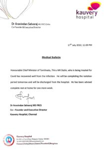 Chief Minister M K Stalin, who was admitted to Kauvery Hospital for COVID has recovered fully, and will be making a public appearance on Monday, July 18.