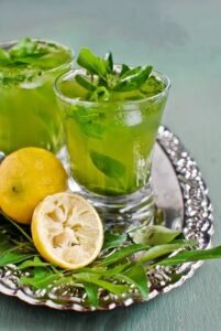 • In a pitcher, combine the curry leaf-infused water, lemon juice, sugar or honey, and remaining water.