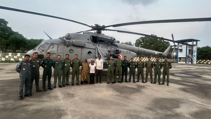 In a swift Humanitarian Assistance and Disaster Relief (HADR) mission, an IAF Mi-17 V5 helicopter rescues three elderly persons stranded in Dharoda village, Kheda district, following heavy flooding of the Sabarmati river-Courtesy: Defence PRO