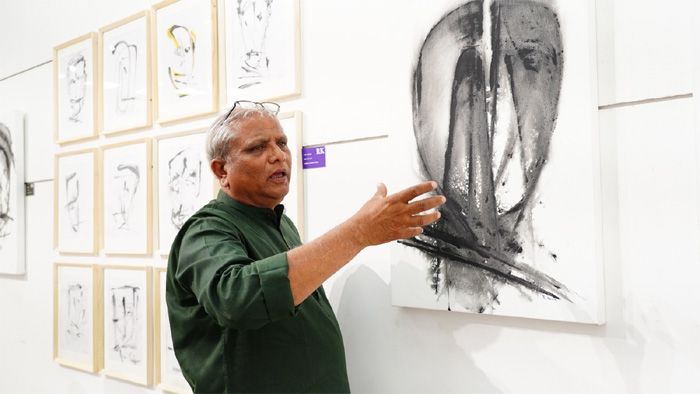 In a journey where bank counters gave way to canvas textures, banker-turned-artist Rajendra Kadia unveils his deeply introspective solo exhibition “FaceSurface: Painting as Process” at L & P Hutheesing Visual Art Centre, running from Tuesday to Sunday -March 17 to 22.