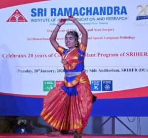 A standout moment was the performance by Kalyani Karthik, currently pursuing a postgraduate degree, who underwent cochlear implantation at the age of three and is SRIHER’s first cochlear implant recipient. She captivated the audience with a classical Bharatanatyam performance, symbolising the life-changing impact of early auditory intervention.