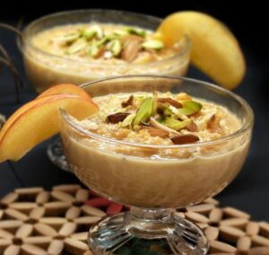 - Place the chilled rabri at the base of the bowls/dish and continue with the assembly of the dessert. At the base place some chilled rabri, top with some fresh mango pulp, the digestive soil, some fresh mango, some nuts, some fresh cream and repeat the layers.