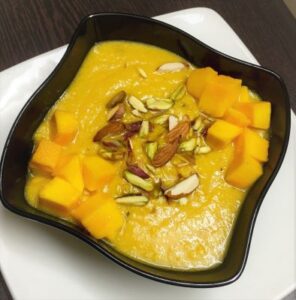 - Finally garnish it and top it up well with mint/ cherries/ chocolate chips etc and allow the dessert to chill in the fridge for around 2-3 hours and then enjoy the real flavour of the mango this season in this combination.