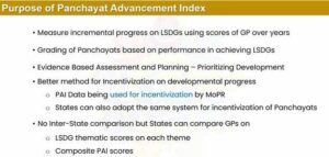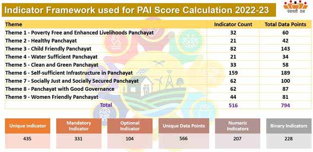 The PAI captures Panchayats’ performance across nine themes of Localized SDGs (LSDGs) ie. Poverty-Free and Enhanced Livelihoods in Panchayat, Healthy Panchayat, Child-Friendly Panchayat, Water-Sufficient Panchayat, Clean and Green Panchayat, Panchayat with Self-Sufficient Infrastructure, Socially Just and Socially Secured Panchayat, Panchayat with Good Governance and Women-Friendly Panchayat. These themes align global goals with rural realities, helping local governments tailor their strategies for holistic development.