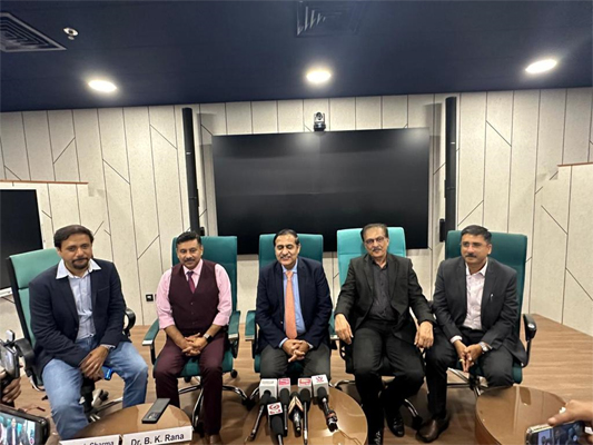 (L to R) Dr Mukesh Sharma, Dr BK Rana, Dr Raajiv Singhal, Dr YC Shah and Gaurav Reikhi at the MoU signing ceremony in Ahmedabad on Saturday.-NE photo