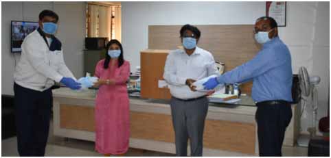 First lot of five lakh triple-ply face masks were handed over to Dr Darsi Suman Ratnam, Managing Director, Gujarat Medical Service Corporation Limited and  Bhartiba Vaghela, Deputy Collector, Government of Gujarat by  Vimal Gupta, General Manager at Krishna Maruti Limited.  Bhavesh Shah, Company Secretary & Legal Head, Suzuki Motor Gujarat looks on. – NE photo