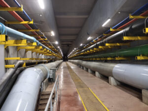 The Utility Tunnel will accommodate all the utilities, including Power Cables, Raw Water supply pipe line to Water Treatment Plant (WTP) as well as treated water supply pipe line from WTP to various developments, chilled water supply from District Cooling Pipe (DCP) to various developments and return pipe line to DCP, ICT cables, Automated Waste Collection pipe line, Fire hydrant water pipe line, etc.