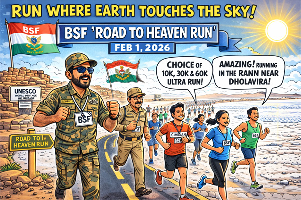 In a powerful celebration of endurance, heritage and national pride, the Border Security Force will organise the ‘BSF Run – Road to Heaven’, a high-endurance adventure run at the iconic Road to Heaven in Dholavira, nestled deep within the Rann of Kutch, on Sunday, February 1, 2026.