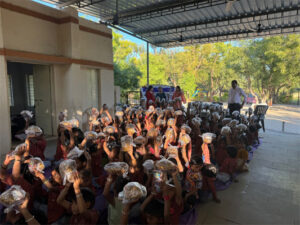 Keeping the winter season in mind, the Rotary Club distributed nutritious snacks of dates and chana. Students eagerly received the food, many sharing with classmates and proudly telling teachers how the snacks would “make them strong and energetic.”