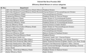 Palakkad Division also led in multiple categories, winning the Manpower Planning Efficiency Shield, Rail Madad, and Electrical Energy Conservation Shield.