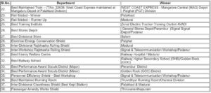 • Best Maintained Train (West Coast Express – Palakkad Division), Best Training Institute (Zonal Electric Traction Training Centre, Avadi), and Best Railway School (RHS Golden Rock).