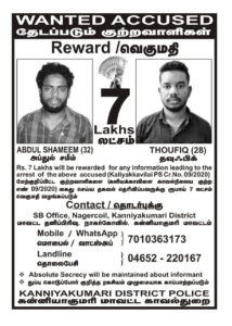 The Tamil Nadu police had announced reward of Rs. 7 lakh to any person giving information leading to the arrest of Shameem and Thoufiq. While the motive of the murder remains a mystery.