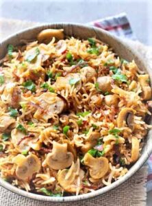 Prepare all the ingredients for the khumb or mushroom pulao recipe. Heat oil and butter in a pan add in the green cardamom, onions, ginger-garlic paste, green chilies and saute them for 2-3 mins. Add in the beaten up curd with all powdered spices and cook on a low flame for 2-3 mins. Now add in the sliced mushrooms and small cubes of potatoes, little water cover and simmer for 3-4 mins. Add in the cooked rice on top, coriander and mint leaves and sprinkle little rose water and cover with a tight fitting lid and cook the pulao in steam for 12-15 mins and serve hot with a bowl of date and walnut raita or a kachumber with fried papad.