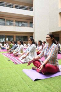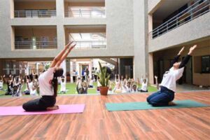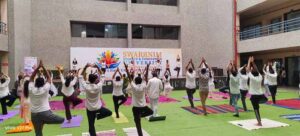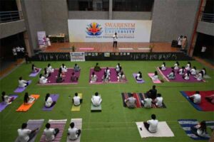The Department of Swasthavritta and Yoga at Aarihant Ayurvedic Medical College and Research Institute (AAMC&RI), part of Swarrnim Startup and Innovation University, organized the 11th International Yoga Divas – ‘Yogotsav 2025’ – on Saturday, at Central Plaza, SSIU, Gandhinagar. This event saw the participation of around 100 to 150 students along with faculty members.