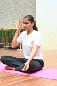 The session started with Omkara chanting, loosening exercises, and asanas from the AYUSH Ministry’s Common Yoga Protocol. These included standing postures like Tadasana and Vrikshasana, sitting asanas like Vajrasana and Shashankasana, supine postures such as Pavanamuktasana and Setubandhasana, and prone asanas like Bhujangasana and Makarasana. Breathing techniques like Kapalabhati, Anulom-Vilom, and Bhramari were also performed. The session ended with Omkara chanting.