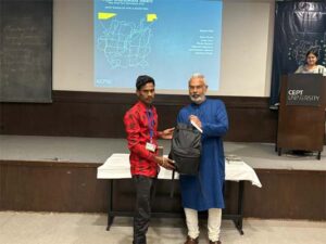The ceremony, held at the CEPT University campus, was graced by Kartikeya Sarabhai, Founder-Director of the Centre for Environment Education (CEE), as Chief Guest, along with Prof. Khandwalla, Prof. Barjor Mehta (President, CEPT), Prof. Tridip Suhrud (Provost), Ms. Anita Hiranandani (Registrar), Prof. Chirayu Bhatt (Dy Provost, Academics), Prof. Chandrani Chakrabarti (Program Chair, MLA), and senior officials from UNM Foundation, CEPT faculty, and students.