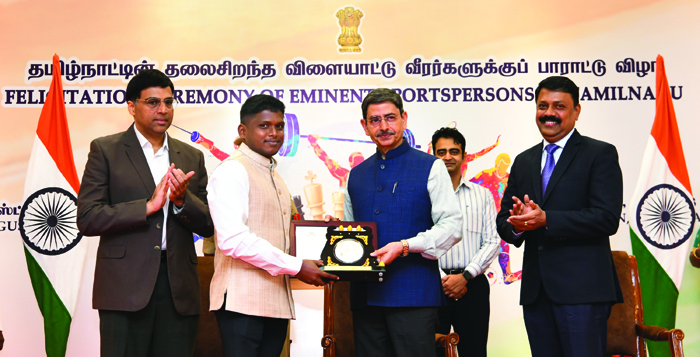 Tamil Nadu Governor RN Ravi felicitated 65 eminent sportspersons from the state for their remarkable performance in Olympics, Paralympics, Chess Olympiad, Common Wealth Games and Kehlo India Youth Games-2022 at the Raj Bhavan here on Sunday.