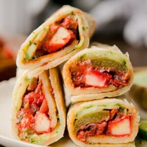 - Warm wrapper, layer chutneys, sauces, and chicken strips.