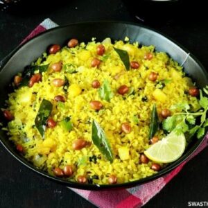 - Now add in the Poha and boiled cubed potatoes, peanuts and toss them well into the masala in the pan. Adjust salt to taste, add grated coconut, nuts, and splash in a little fresh lime juice to taste before serving.