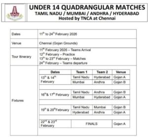 In a significant boost to grassroots cricket, the Tamil Nadu Cricket Association (TNCA) will host the Under-14 Quadrangular Invitational Tournament for Boys from February 13 to February 23, 2026, in Chennai.